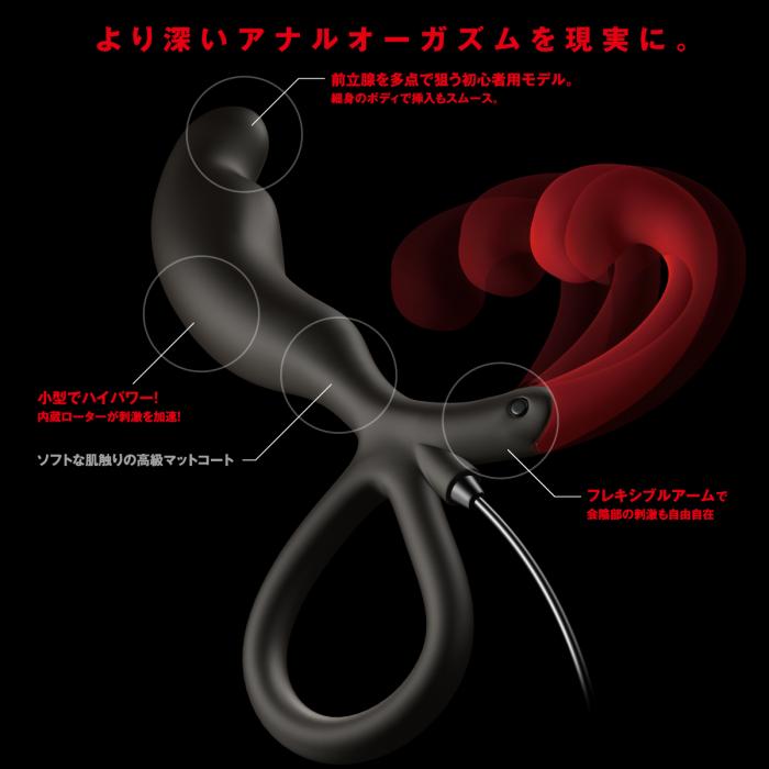 前立腺刺激を手軽に深く愉しむ為、会陰部フックに3段階調節の可動式アームを採用。会陰を固定する事でより刺激的な振動を生みます。